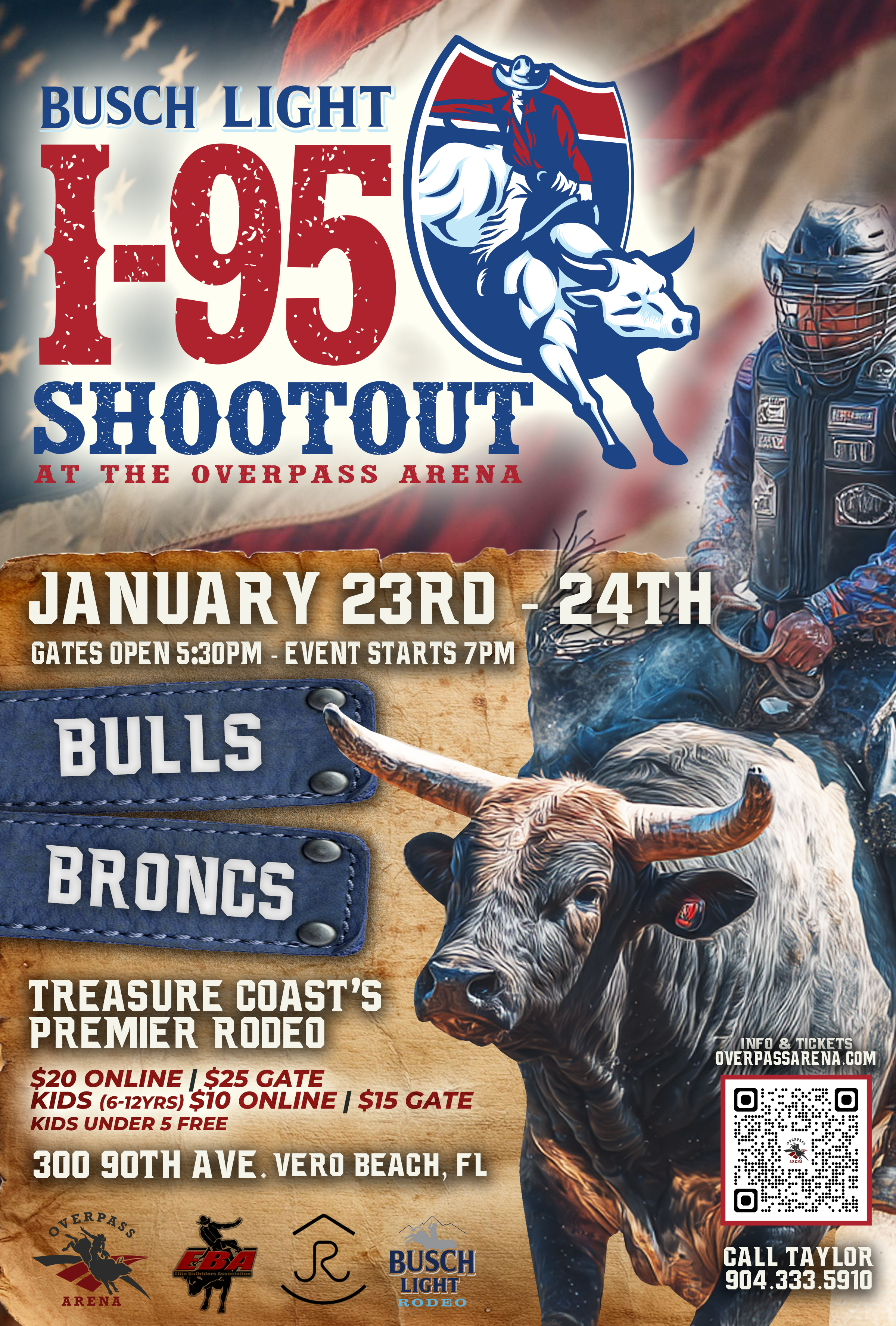 <p>Get ready for two action-packed days of adrenaline and tradition at the <strong>I-95 Shootout</strong>, hosted at the <strong>Overpass Arena in Vero Beach</strong>. Experience top riders, powerful bulls, and the raw energy of the rodeo under the arena lights. From Bull Riding to Ranch Bronc Riding, every moment is built for excitement.</p><p>📍 <strong>Location:</strong> 300 90th Ave, Vero Beach, FL 32968<br>📅 <strong>Dates:</strong> January 23rd & 24th, 2026</p><p>⏰ <strong>Daily Schedule:</strong><br><strong>FRIDAY & SATURDAY</strong><br>• Gates Open: 5:30 PM<br>• Rodeo Starts: 7:00 PM</p><p>🎟️ <strong>Ticket Details:</strong><br>• <strong>Kids 5 & Under:</strong> FREE (Must be accompanied by a paying adult)<br>• <strong>Kids Tickets (6 to 12 Years Old):</strong> <span style="background-color:rgb(255,255,255);color:rgb(22,21,19);"><span style="-webkit-text-stroke-width:0px;display:inline !important;float:none;font-family:"Segoe UI", Tahoma, Geneva, Verdana, sans-serif;font-size:14px;font-style:normal;font-variant-caps:normal;font-variant-ligatures:normal;font-weight:400;letter-spacing:normal;orphans:2;text-align:start;text-decoration-color:initial;text-decoration-style:initial;text-decoration-thickness:initial;text-indent:0px;text-transform:none;white-space:normal;widows:2;word-spacing:0px;">$10 Online Pre-Sale Discount / $15 When the gates open</span></span> ⚠️ Only if tickets are still available!<br>• <strong>Adult Tickets (13 Yeas Old And Older):</strong> <span style="background-color:rgb(255,255,255);color:rgb(22,21,19);"><span style="-webkit-text-stroke-width:0px;display:inline !important;float:none;font-family:"Segoe UI", Tahoma, Geneva, Verdana, sans-serif;font-size:14px;font-style:normal;font-variant-caps:normal;font-variant-ligatures:normal;font-weight:400;letter-spacing:normal;orphans:2;text-align:start;text-decoration-color:initial;text-decoration-style:initial;text-decoration-thickness:initial;text-indent:0px;text-transform:none;white-space:normal;widows:2;word-spacing:0px;">$20 Online Pre-Sale Discount / $25 When the gates open</span></span> ⚠️ Only if tickets are still available!</p><p>📌 <strong>Important Information:</strong><br>• 🎟️ Tickets will be scanned at the gate<br>• 🚫 No Re-Entry – Once you leave, a new ticket is required<br>• 🚫 No alcohol or outside food/beverages permitted<br>• 🎫 All sales are final – please review our Terms & Conditions before purchasing</p><p><strong>🎟️</strong> <strong>This event will sell out fast, </strong>so grab your tickets now and get ready for two incredible nights at the <strong>OverPass Arena</strong>. Come out, cheer on your favorites, and create unforgettable memories. </p><p>🆘 <strong>Need Help?</strong><br>🎟️ Ticket Support:<br>📧 <a href="mailto:support@myticketfox.com">support@myticketfox.com</a> | 📞 888-534-8369</p><p>📢 Event Info:<br>📧 <a href="mailto:support@myticketfox.com">overpassarena@gmail.com</a>| 📞 727-766-245</p>