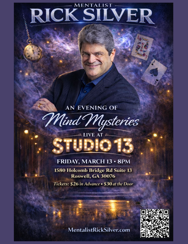 <p>Step into a Night of Mind‑Bending Wonder…</p><p>Prepare for an unforgettable experience as Mentalist Rick Silver brings his extraordinary talents to Studio 13 in Roswell, Georgia on March 13th at 8 PM for An Evening of Mind Mysteries.</p><p>Rick Silver is Atlanta’s premier mentalist, known for delivering performances that blend impossible predictions, thought‑reading, psychological illusions, and laugh‑out‑loud moments into a mesmerizing, interactive experience. With over 20 years of captivating audiences, Rick creates a show where you are part of the magic—no stooges, no plants, just pure, mind‑bending entertainment.</p><p>From the moment the lights dim, you’ll witness stunning feats that challenge your senses and defy explanation. Guests are often left asking, “How is that even possible?” as predictions come true, choices are revealed before they’re made, and thoughts seem to be pulled straight from the mind. The atmosphere is electric, the humor is genuine, and every moment is crafted to surprise and delight</p><p>This show is:</p><p>Interactive – Audience participation is at the heart of every moment.</p><p>Family‑friendly – Clean, respectful entertainment where everyone has fun.</p><p>Authentic – No hidden helpers… what you see is what’s happening.</p><p>Unforgettable – Guests consistently call it “amazing,” “mind‑blowing,” and “a must‑see.”</p><p>Whether you’re planning a memorable night out, love immersive entertainment, or simply want to witness the extraordinary, this is an evening that will stay with you long after the final reveal.</p><p>Reserve your seat now and get ready to experience the impossible.</p>