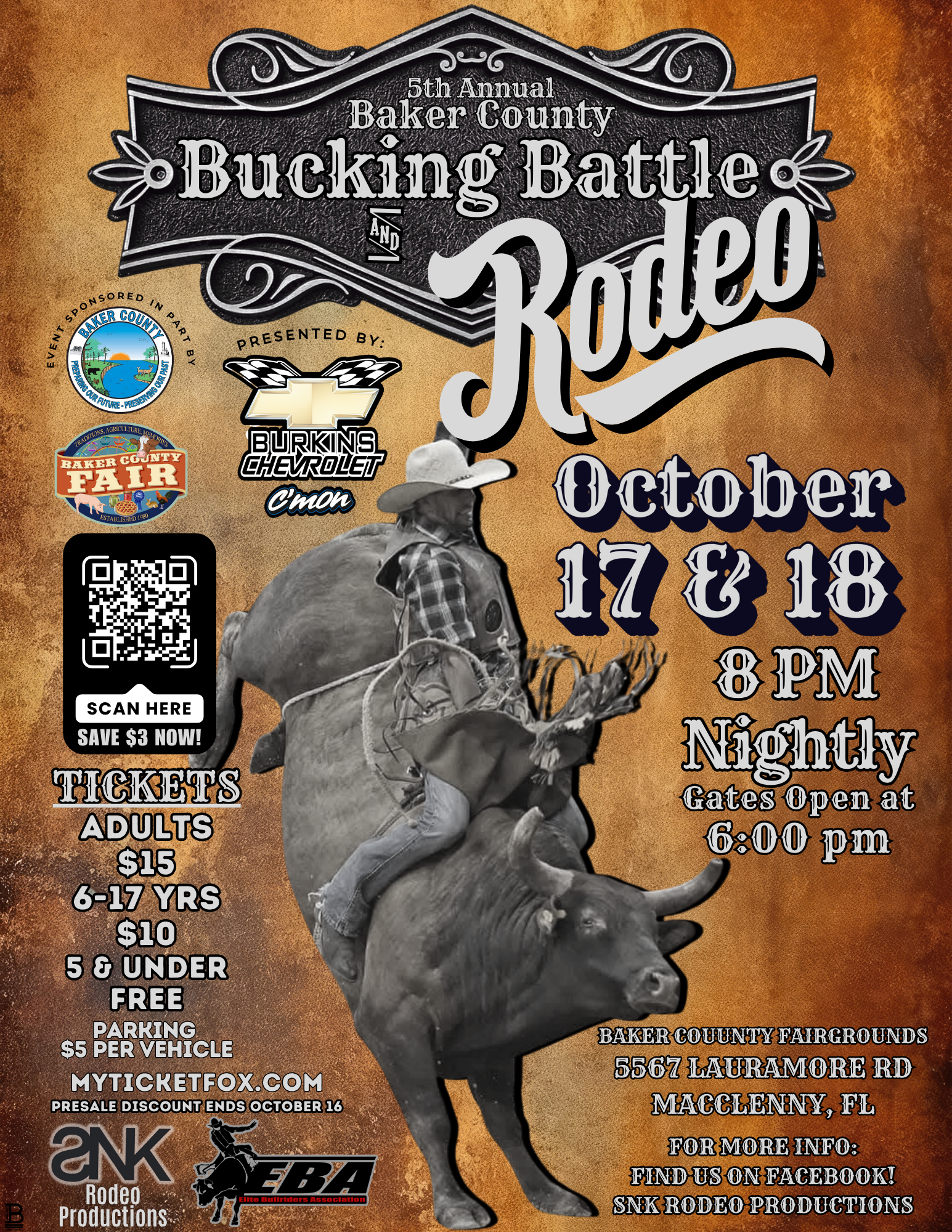 <div class="ck-content"><h3 data-start="179" data-end="216">π Get Ready, North Florida! π</h3><p data-start="217" data-end="308"><strong data-start="217" data-end="271">The 5th Annual Baker County Bucking Battle & Rodeo</strong> is backβbigger and wilder than ever!</p><p data-start="310" data-end="606"><strong data-start="310" data-end="335">SNK Rodeo Productions</strong> is bringing the <strong data-start="352" data-end="382">bulls, broncs, and barrels</strong> to <strong data-start="386" data-end="403">MacClenny, FL</strong> for <strong data-start="408" data-end="436">two action-packed nights</strong> of rodeo excitement. Donβt miss the heart-pounding thrills from top <strong data-start="505" data-end="553">bull riders, barrel racers, and bronc riders</strong> as they compete at the <strong data-start="577" data-end="606">Baker County Fairgrounds!</strong></p><p style="-webkit-text-stroke-width:0px;background-color:rgb(255, 255, 255);box-sizing:border-box;color:rgb(22, 21, 19);font-family:"Oracle Sans", -apple-system, BlinkMacSystemFont, "Segoe UI", Roboto, Oxygen, Ubuntu, Cantarell, "Fira Sans", "Droid Sans", "Helvetica Neue", sans-serif;font-size:14px;font-style:normal;font-variant-caps:normal;font-variant-ligatures:normal;font-weight:400;letter-spacing:normal;line-height:inherit;margin-block:0px 16px;orphans:2;outline-color:rgb(95, 125, 79);text-align:left;text-decoration-color:initial;text-decoration-style:initial;text-decoration-thickness:initial;text-indent:0px;text-shadow:white -1px 0px, white 0px 1px, white 1px 0px, white 0px -1px;text-transform:none;white-space:normal;widows:2;word-spacing:0px;">π <strong data-start="616" data-end="629">Location:</strong> Baker County Fairgrounds, MacClenny, FL<br>π <strong data-start="668" data-end="678">Dates:</strong> October 17 & 18, 2025<br>β° <strong data-start="705" data-end="720">Gates Open:</strong> 6:00 PM | <strong data-start="731" data-end="748">Rodeo Starts:</strong> 8:00 PM<br>π§οΈ <strong data-start="763" data-end="800">Rain or Shine β The Show Goes On!</strong></p><h3 data-start="807" data-end="829">ποΈ Ticket Info:</h3><p data-start="830" data-end="943"><strong data-start="830" data-end="864">Advance Tickets (Online Only):</strong><br>β’ $12 Adults | $7 Kids<br>β οΈ <em data-start="895" data-end="943"><i>Pre-sale discount ends October 16 at 11:59 PM!</i></em></p><p data-start="945" data-end="1004"><strong data-start="945" data-end="976">At the Gate (if available):</strong><br>β’ $15 Adults | $10 Kids</p><p data-start="1006" data-end="1096">π <strong data-start="1009" data-end="1021">Parking:</strong> $5 per vehicle<br>πΆ <strong data-start="1042" data-end="1061">Kids 5 & Under:</strong> FREE (must be with a paying adult)</p><p style="-webkit-text-stroke-width:0px;background-color:rgb(255, 255, 255);box-sizing:border-box;color:rgb(22, 21, 19);font-family:"Oracle Sans", -apple-system, BlinkMacSystemFont, "Segoe UI", Roboto, Oxygen, Ubuntu, Cantarell, "Fira Sans", "Droid Sans", "Helvetica Neue", sans-serif;font-size:14px;font-style:normal;font-variant-caps:normal;font-variant-ligatures:normal;font-weight:400;letter-spacing:normal;line-height:inherit;margin-block:0px 16px;orphans:2;outline-color:rgb(95, 125, 79);text-align:left;text-decoration-color:initial;text-decoration-style:initial;text-decoration-thickness:initial;text-indent:0px;text-shadow:white -1px 0px, white 0px 1px, white 1px 0px, white 0px -1px;text-transform:none;white-space:normal;widows:2;word-spacing:0px;">π <strong style="box-sizing:border-box;font-weight:bolder;outline-color:rgb(95, 125, 79);">Important Information:</strong><br>β’ Tickets will be scanned at the gate<br>β’ π« No Re-Entry β Once you leave, a new ticket is required<br>β’ π« No outside food or drinks<br>β’ π« No coolers or water bottles / cups<br>β’ π« All sales are final β please review our Terms & Conditions before purchasing</p><h3 data-start="1449" data-end="1466">π Need Help?</h3><p data-start="1468" data-end="1534"><strong data-start="1468" data-end="1487">Ticket Support:</strong><br>π§ <a class="cursor-pointer" data-start="1493" data-end="1516" rel="noopener">support@myticketfox.com</a><br>π 888-534-8369</p><p data-start="1536" data-end="1594"><strong data-start="1536" data-end="1551">Event Info:</strong><br>π§ <a class="cursor-pointer" data-start="1557" data-end="1576" rel="noopener">sphil005@icloud.com</a><br>π 904-334-2378</p></div>