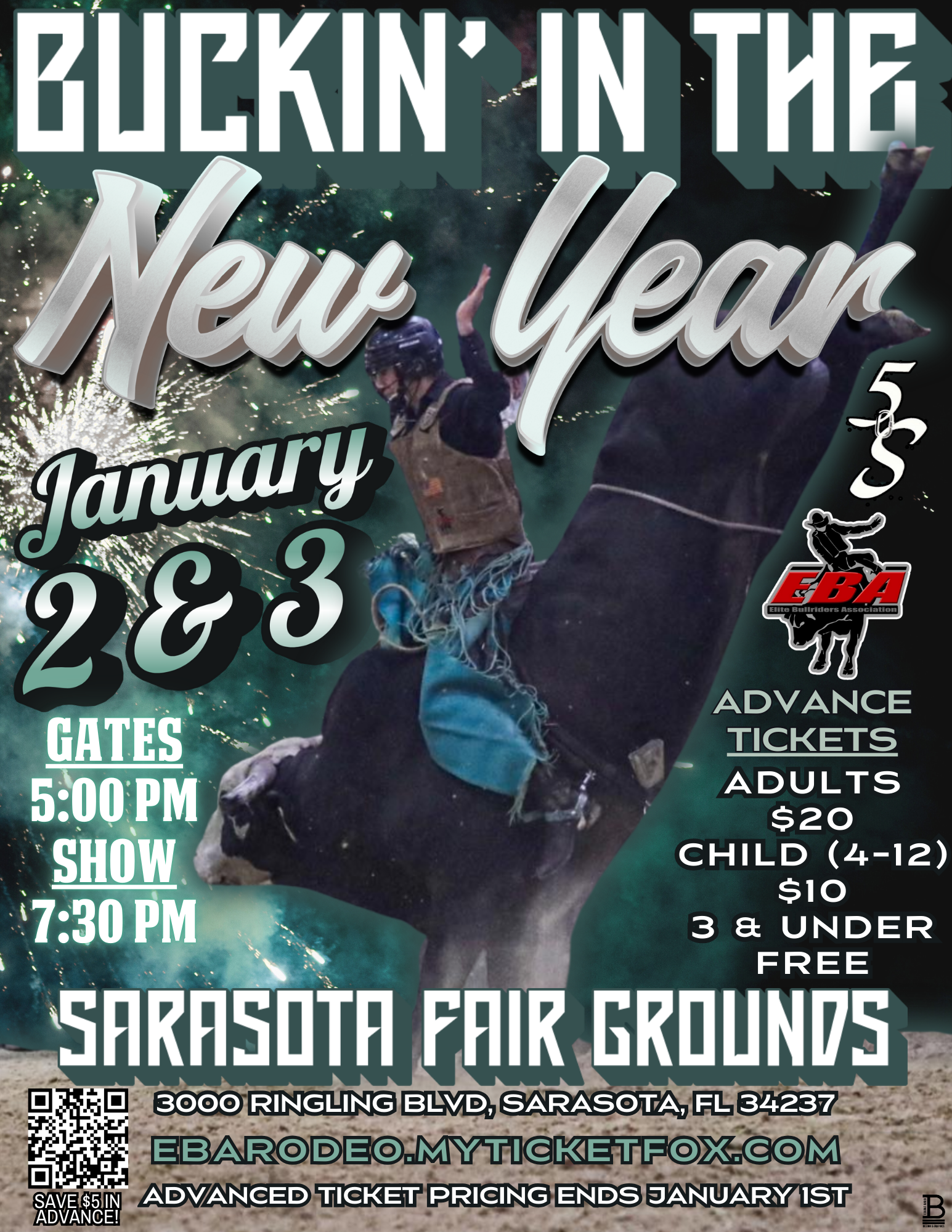 <div class="ck-content"><p data-start="126" data-end="442">🐂✨ Ring in the New Year with Rodeo Action! ✨🐎<br>Start 2026 off right with <strong data-start="202" data-end="253">two action-packed nights of Bull & Bronc Riding</strong> at the legendary <strong data-start="271" data-end="304">Sarasota Fair Grounds in Sarasota, FL</strong>!<br>Come early to enjoy mouthwatering food trucks, shop local vendors, and soak in the electric atmosphere before the main event begins.</p><p data-start="444" data-end="518">📍 <strong data-start="447" data-end="459">Location</strong><br>Sarasota Fair Grounds – 3000 Ringling Blvd, Sarasota, FL 34237</p><p data-start="520" data-end="540">📅 <strong data-start="523" data-end="538">Event Dates</strong></p><ul data-start="541" data-end="590"><li data-start="541" data-end="564"><p data-start="543" data-end="564">Friday, January 2nd</p></li><li data-start="565" data-end="590"><p data-start="567" data-end="590">Saturday, January 3rd</p></li></ul><p data-start="592" data-end="609">🕒 <strong data-start="595" data-end="607">Schedule</strong></p><ul data-start="610" data-end="659"><li data-start="610" data-end="633"><p data-start="612" data-end="633">Gates Open: 5:00 PM</p></li><li data-start="634" data-end="659"><p data-start="636" data-end="659">Rodeo Starts: 7:30 PM</p></li></ul><p data-start="661" data-end="684">🎟️ <strong data-start="665" data-end="682">Ticket Prices</strong></p><ul data-start="685" data-end="794"><li data-start="685" data-end="713"><p data-start="687" data-end="713">Kids 3 & Under: <strong data-start="703" data-end="711">FREE</strong></p></li><li data-start="714" data-end="753"><p data-start="716" data-end="753">Kids (4–12): $10 Advance / $15 Gate</p></li><li data-start="754" data-end="794"><p data-start="756" data-end="794">Adults (13+): $20 Advance / $25 Gate</p></li></ul><p data-start="796" data-end="875">⚠️ <strong data-start="799" data-end="851">Online Discount Ends January 1st at 11:59 PM EST</strong> – Buy early and save!</p><p data-start="877" data-end="900">📌 <strong data-start="880" data-end="898">Important Info</strong></p><ul data-start="901" data-end="1128"><li data-start="901" data-end="940"><p data-start="903" data-end="940">Tickets must be scanned at the gate</p></li><li data-start="1032" data-end="1069"><p data-start="1034" data-end="1069">No outside food or drinks allowed</p></li><li data-start="1070" data-end="1128"><p data-start="1072" data-end="1128">All sales are final – please review Terms & Conditions</p></li></ul><p data-start="1130" data-end="1218">🆘 <strong data-start="1133" data-end="1147">Need Help?</strong><br>🎟️ Ticket Support:<br>📧 <a class="decorated-link cursor-pointer" data-start="1175" data-end="1198" rel="noopener">support@myticketfox.com<span class="ms-0.5 inline-block align-middle leading-none" aria-hidden="true"><svg class="block h-[0.75em] w-[0.75em] stroke-current stroke-[0.75]" width="20" height="20" viewBox="0 0 20 20" fill="currentColor" xmlns="http://www.w3.org/2000/svg" data-rtl-flip=""><path d="M14.3349 13.3301V6.60645L5.47065 15.4707C5.21095 15.7304 4.78895 15.7304 4.52925 15.4707C4.26955 15.211 4.26955 14.789 4.52925 14.5293L13.3935 5.66504H6.66011C6.29284 5.66504 5.99507 5.36727 5.99507 5C5.99507 4.63273 6.29284 4.33496 6.66011 4.33496H14.9999L15.1337 4.34863C15.4369 4.41057 15.665 4.67857 15.665 5V13.3301C15.6649 13.6973 15.3672 13.9951 14.9999 13.9951C14.6327 13.9951 14.335 13.6973 14.3349 13.3301Z"></path></svg></span></a> | 📞 888-534-8369</p><p data-start="1220" data-end="1260">📢 Event Info:<br>📧 <a class="decorated-link cursor-pointer" data-start="1240" data-end="1258" rel="noopener">ebarodeo@gmail.com</a></p></div>